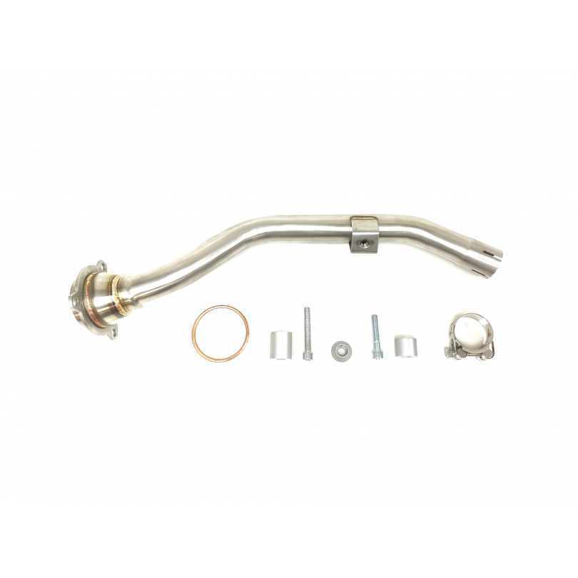 Ein aus rostfreiem AISI304 stahl hergestellter schalldämpfer mit einer seidenmatt polierten oberfläche. Die aus aluminium gefertigte asymetrische und konische endkappe wurde mit einer hitzebeständigen schwarzen lackierung vollendet.